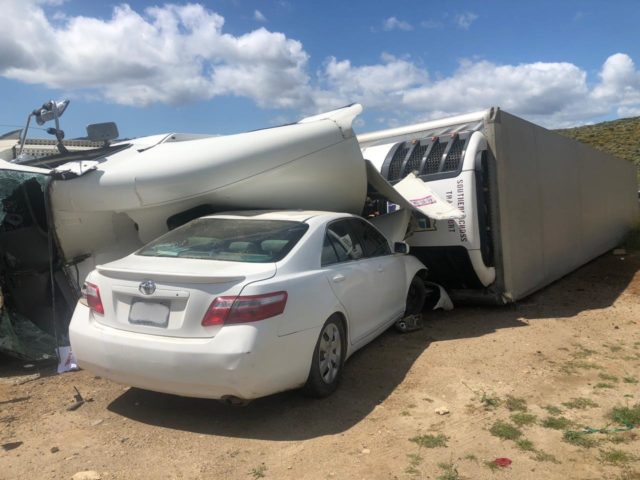 Los primeros datos recabados indican que el chofer del tractocamión se dirigía hacia el sur, y al llegar a la curva, al parecer, perdió el control, volcándose hasta impactar el carro.