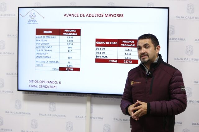 En el reporte cotidiano de la Estrategia Covid, el Secretario de Salud del Estado, Alonso Óscar Pérez Rico, informó que 23 mil 508 vacunas van aplicadas en Baja California en adultos mayores; estrategia que se mantiene y en breve iniciará en la ciudad de Ensenada, para luego hacer el despliegue a las zonas suburbanas y urbanas de Mexicali.