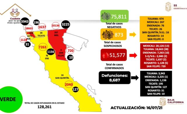 Respecto a las cifras específicas de Ensenada, suman 93 casos activos, 76 personas catalogadas como sospechosas de contraer la enfermedad, así como mil 156 muertes desde el inicio de la contingencia. Asimismo, San Quintín tiene 8 casos activos, 16 sospechosos y 127 decesos.