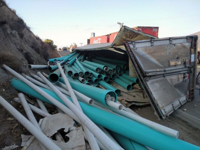 Un tractocamión que transportaba tubería de plástico se volcó esta mañana en el puente de San Vicente, resultado lesionado el conductor.