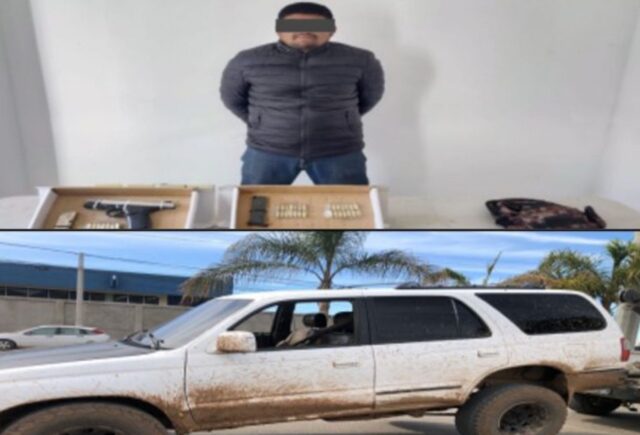 En consecuencia, en los asientos observaron cartuchos útiles. El conductor fue identificado como José Alfredo “N”, de 28 años de edad, originario de Tijuana, a quien entre sus ropas le encontraron un arma de fuego corta, mientras que en el vehículo encontraron: