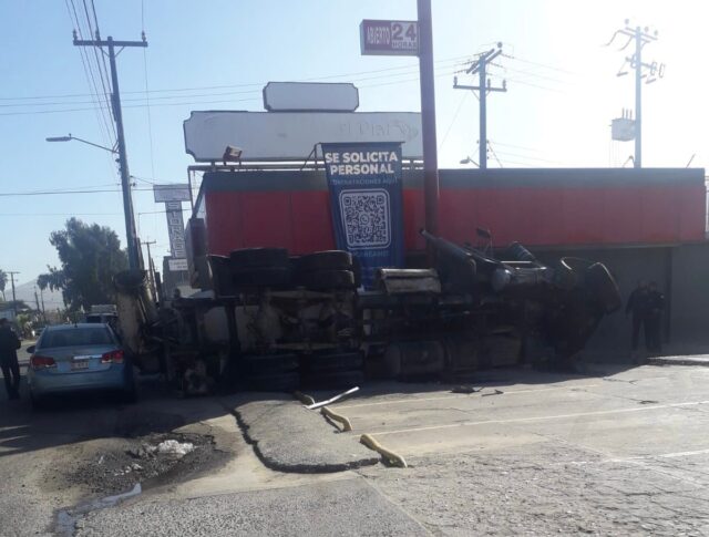 Una pipa revolvedora de cemento se volcó la mañana de este viernes en el estacionamiento de un centro comercial de Ensenada, ante lo cual logró impactar a un vehículo estacionado.