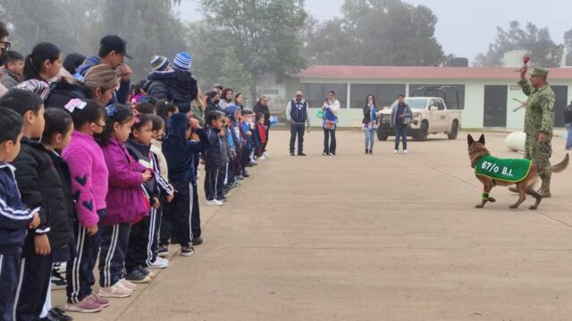 San Quintín.- En el marco del Día de la Bandera, más de cien niños del preescolar Padre Kino, maestras, madres y padres de familia, acudieron este jueves a una visita guiada en las instalaciones del 67 Batallón de Infantería de San Quintín.