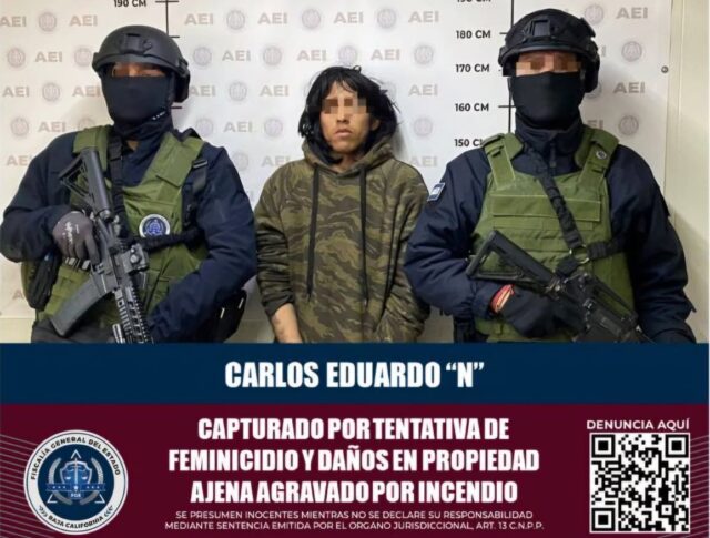 Ensenada.- Agentes de la Fiscalía General del Estado capturaron a Carlos Eduardo “N”, señalado como presunto autor de delitos de daño en propiedad ajena por incendio y tentativa de feminicidio, en incidente ocurrido en una vivienda de la colonia Invasión Aguajito.