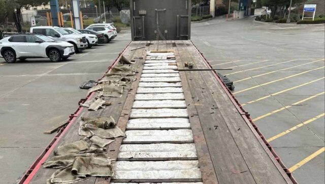 Durante la inspección secundaria, los agentes recibieron una alerta positiva del equipo canino K-9. Un examen más detallado del tractocamión reveló 38 paquetes que se habían retirado del piso del remolque de la plataforma. El contenido de los paquetes pesaba 437 libras y dio positivo en metanfetamina.
