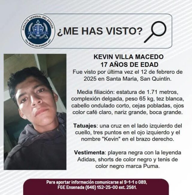 San Quintín.- La Fiscalía General del Estado solicita apoyo para localizar a Kevin Villa Macedo, de 17 años de edad, quien fue visto por última vez el 12 de febrero de 2025 en Santa María, al sur de San Quintín.