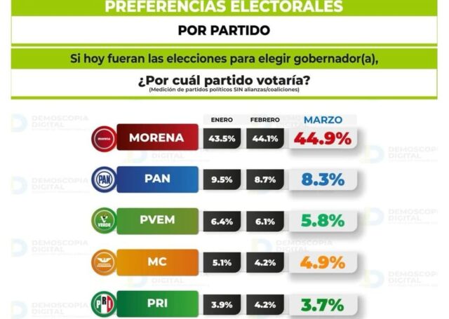 Baja California, 20 de marzo del 2025.- Según la más reciente encuesta Rumbo al 2027, de Demoscopia Digital y La Jornada, “Rumbo al 2027” para la gubernatura de Baja California, si hoy fueran las elecciones, Morena obtendría el triunfo con un 44.9 por ciento de las preferencias.