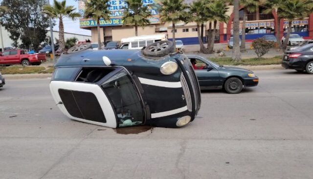 Ensenada.- El conductor de un mini Cooper impactó este martes a otro vehículo hasta quedar volcadora sobre la avenida Reforma, en Ensenada, tras lo cual optó por darse a la fuga.