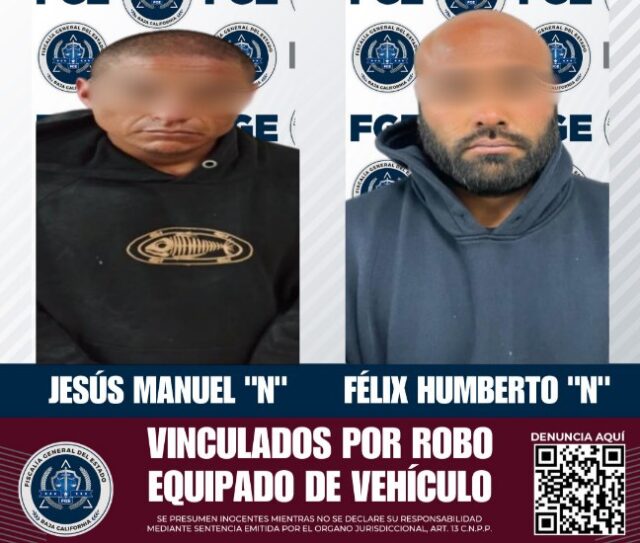 Ensenada .- A través de los elementos de prueba presentados por la Fiscalía Regional de Ensenada ante un Juez de Control, lograron la vinculación a proceso de Félix Humberto “N” y Jesús Manuel “N”, acusados del delito de robo equiparado de vehículo.