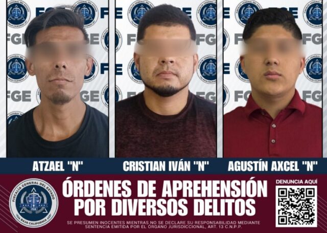 Ensenada.- La Fiscalía General del Estado, a través de la Agencia Estatal de Investigación (AEI), cumplimentó tres órdenes de aprehensión en contra de personas requeridas por diversos delitos, en hechos registrados en distintos puntos del municipio de Ensenada.