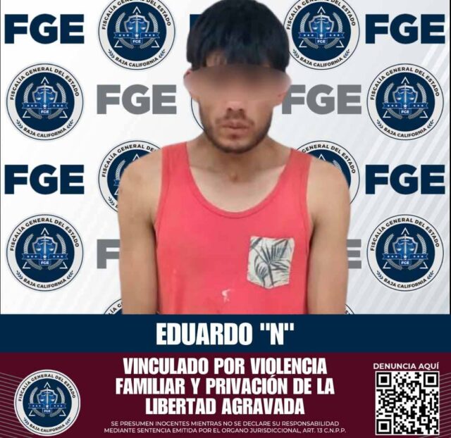 San Quintín.- La Fiscalía General del Estado (FGE) obtuvo la vinculación a proceso y la imposición de prisión preventiva justificada, en atención al riesgo que representa para la víctima, contra Eduardo “N” por los delitos de violencia familiar y privación ilegal de la libertad.
