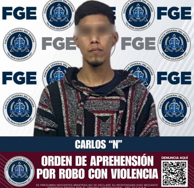 Ensenada.– La Fiscalía General del Estado, a través de la Agencia Estatal de Investigación (AEI), cumplimentó una orden de aprehensión en contra de Carlos “N”, de 22 años, por su presunta responsabilidad en el delito de robo con violencia.