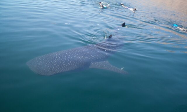 Paola mencionó que gracias a que el tiburón ballena se alimenta de plancton, regularmente se encuentra en la superficie, lo que facilita que se pueda observar desde la embarcación, como lo hace actualmente el grupo de monitoreo, o desde el aire, con el dron.