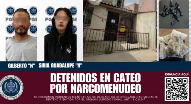 La diligencia se llevó a cabo el 7 de mayo, a las 15:36 horas. En el lugar fueron detenidos Siria Guadalupe “N” y Gilberto “N”, quienes quedaron a disposición del Ministerio Público para determinar su situación jurídica.