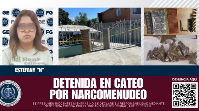 Ensenada.- La Fiscalía General del Estado, a través de la Fiscalía Especializada en Narcomenudeo, detuvo a Estefany N y aseguró drogas y cartuchos útiles tras un cateo en un domicilio ubicado en la colonia Piedras Negras, en Ensenada.