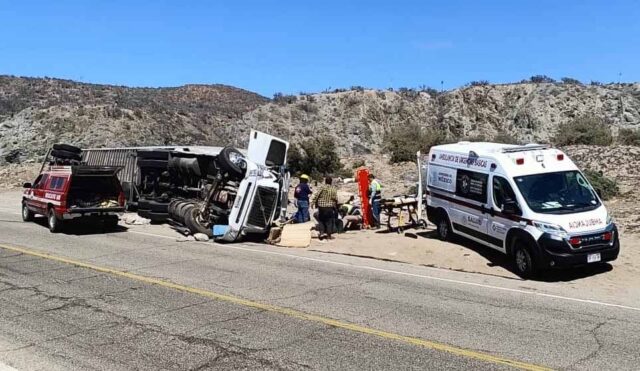 San Quintín.- El conductor de un tracto camión requirió atención médica tras protagonizar una volcadura en la curva San Javier, ubicada en el sur de San Quintín y cerca de los límites con de Baja California Sur.