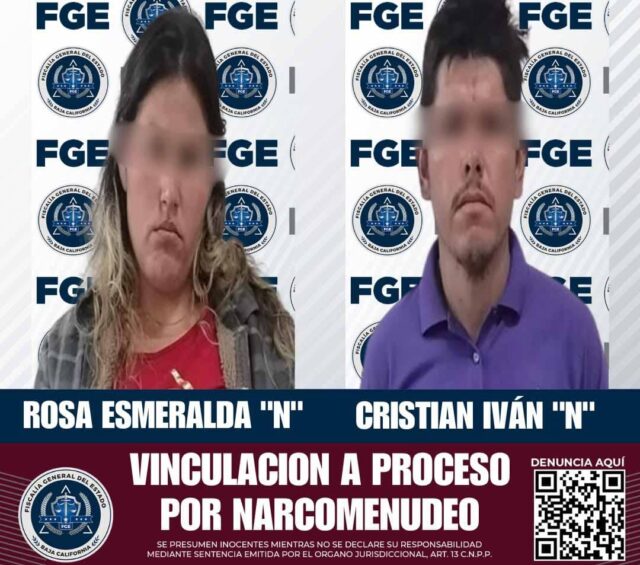 Ensenada.- La Fiscalía General del Estado, a través de la Fiscalía Especializada en Narcomenudeo, obtuvo la vinculación a proceso de Cristian Iván “N” y Rosa Esmeralda “N” por su presunta responsabilidad en delitos contra la salud en la modalidad de narcomenudeo.