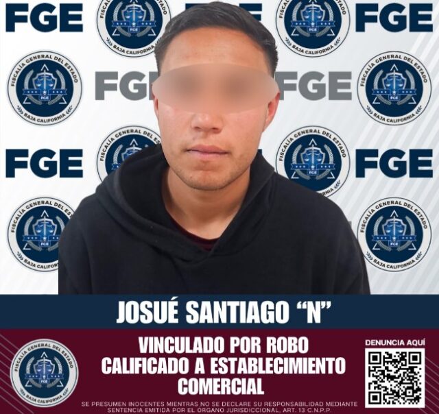 Ensenada.- La Fiscalía General del Estado, a través de la Unidad de Investigación de Robos, obtuvo la vinculación a proceso de Josué Santiago “N”, por su probable responsabilidad en el delito de robo calificado cometido en establecimiento comercial con servicio al público.