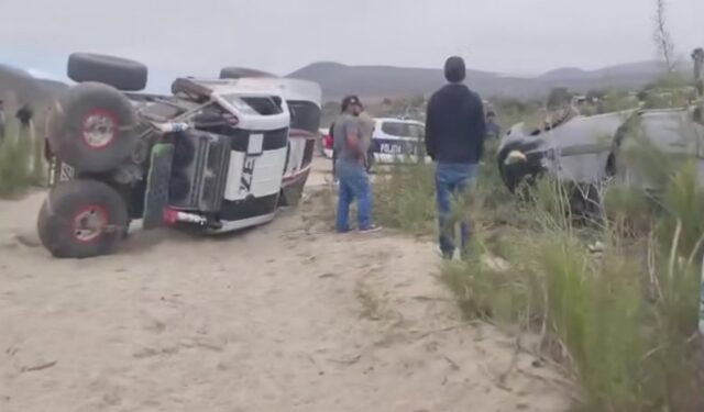 En el lugar dos vehículos se encontraban volcados. El primero correspondía a un vehículo tipo Trophy Truck, color blanco con negro, y el segundo un automóvil Toyota Scion, en color gris.