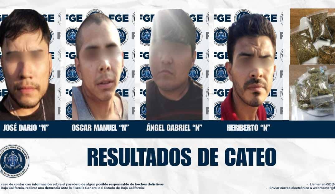 Como resultado del cateo, fueron detenidos Heriberto “N”, Ángel Gabriel “N”, Óscar Manuel “N” y José Darío “N”, tras ser encontrados en posesión de 12 envoltorios con marihuana.