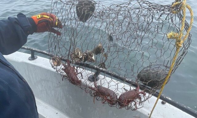 Ensenada.- Durante recorridos de inspección y vigilancia de la SEMAR y CONAPESCA, liberaron 65 langostas rojas y 10 cangrejos, además de asegurar 60 trampas irregulares y artes de pesca, en inmediaciones de la Isla Todos Santos en Ensenada.