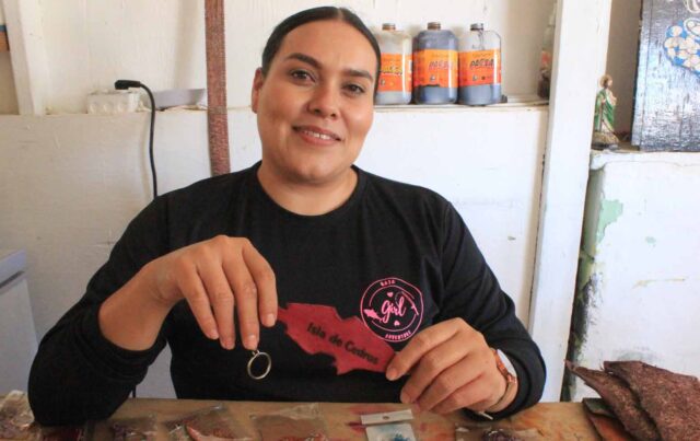 Isbi Giezi Espinoza Arce, representante del grupo de Artesanas de Huamalhua y de Baja Girl Adventure, en Isla de Cedros, reconoció que a través de la Secretaría de Pesca y Acuacultura (SEPESCA BC), han recibido el apoyo para emprender este proyecto generador de bienestar para sus familias y su comunidad.