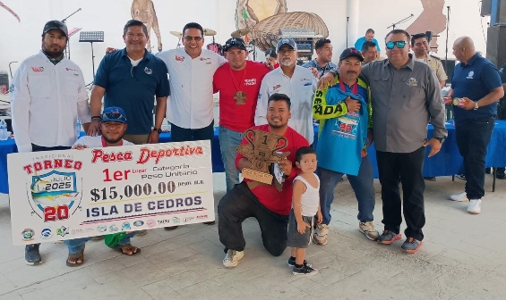 Ensenada. – En el XX Torneo de Pesca Deportiva de Jurel, realizado en Isla de Cedros, un ejemplar de 43 libras (19.5 k.) dio el triunfo al equipo “Los Angels” en la categoría de peso unitario, mientras que la escuadra “Los Machines” llegó a la báscula con otra gran pieza, pero de 41.5 libras (18.8 k.), para obtener el segundo lugar.