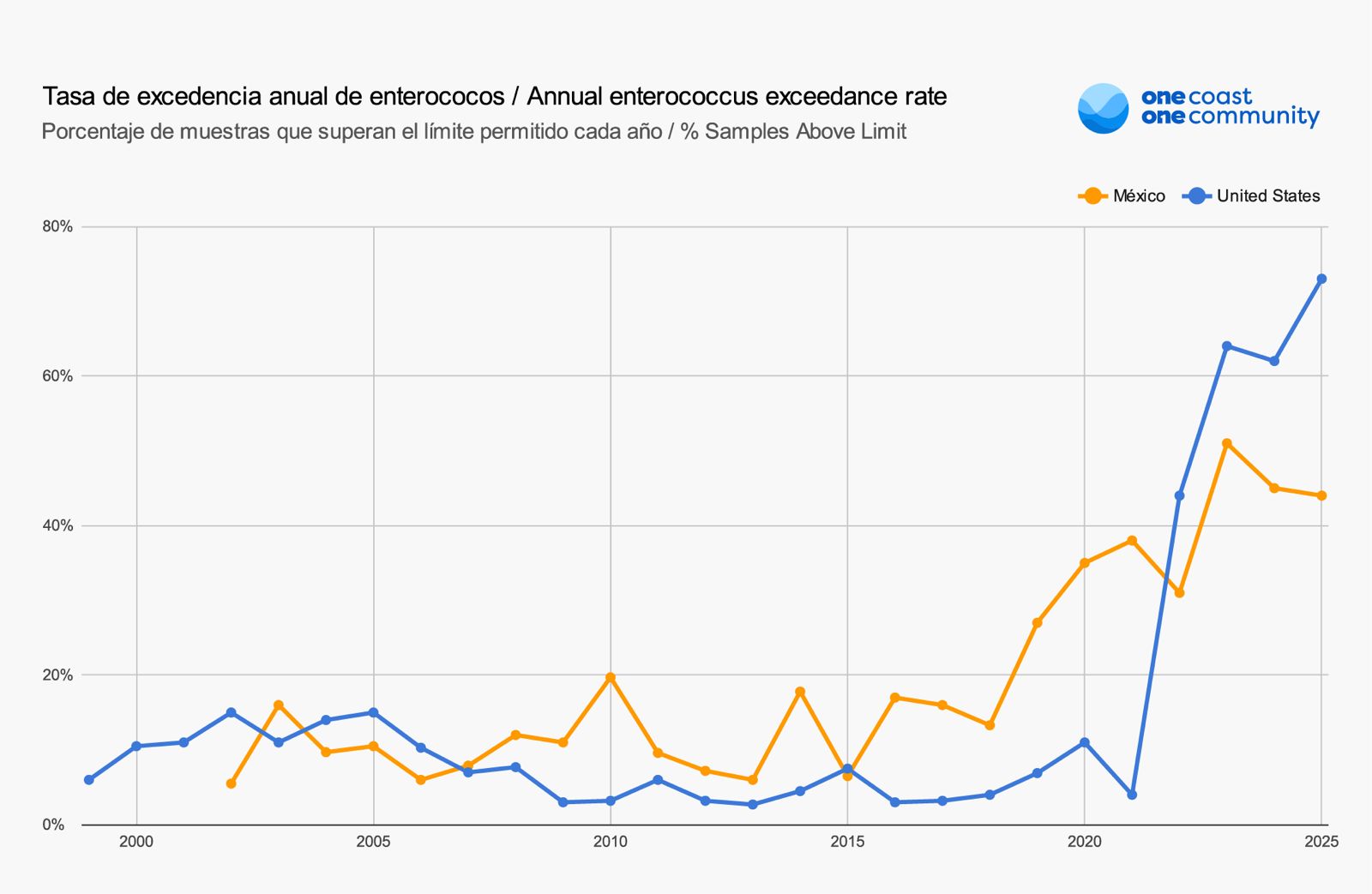 La investigación revela que de 1999 a 2017, las playas de México y Estados Unidos registraron pocos casos que superaran los límites de enterococos. Pero desde 2018 en México y 2020 en Estados Unidos, la contaminación comenzó a aumentar con rapidez.