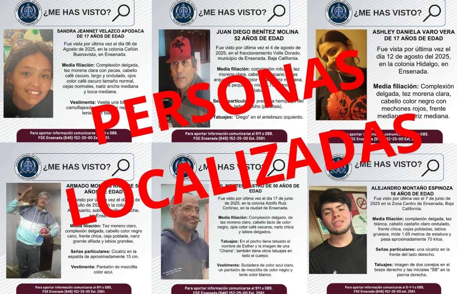 Ensenada.- La Fiscalía General del Estado, a través de la Unidad Especializada para la Investigación y Persecución de Delitos de Desaparición Forzada y Desaparición Cometida por Particulares, informó la localización de seis personas – incluyendo tres menores – que contaban con reporte de desaparición.