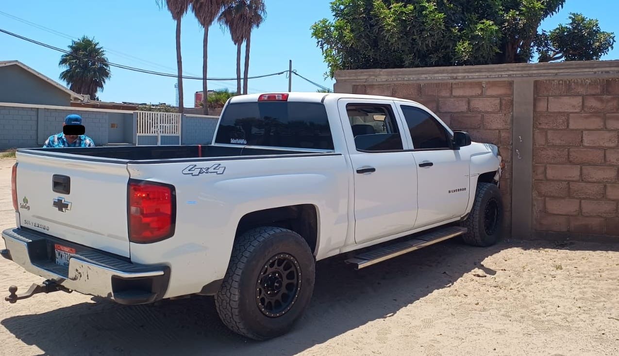 San Quintín.- Al parecer después de ingerir bebidas alcohólicas, un trabajador a bordó de un pick up Chevrolet Silverado – propiedad de su patrón – provocó daños a un vehículo estacionado en un comercio y posteriormente terminó impactado contra la barda de una propiedad del ejido El Papalote, al sur de San Quintín.