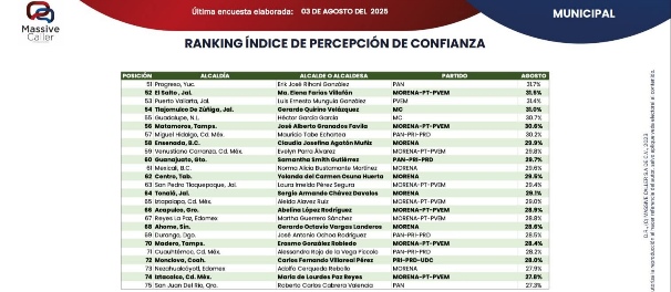 Y del ranking de “Percepción de Inseguridad”, el alcalde fronterizo fue calificado con un 57.7 por ciento, mientras que la presidenta municipal de Ensenada contó con un 46.5 por ciento, según los datos divulgados por Massive Caller.