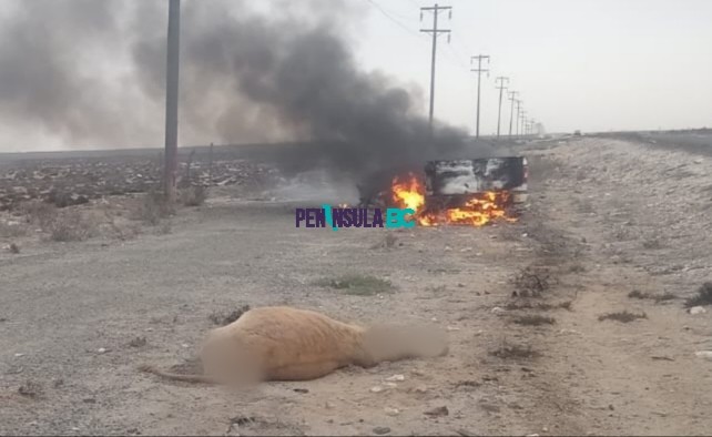 San Quintín.- Un vehículo se incendió este miércoles tras impactar a un bovino que deambulaba sobre la carretera en las inmediaciones de Villa de Jesús María, al sur de San Quintín.