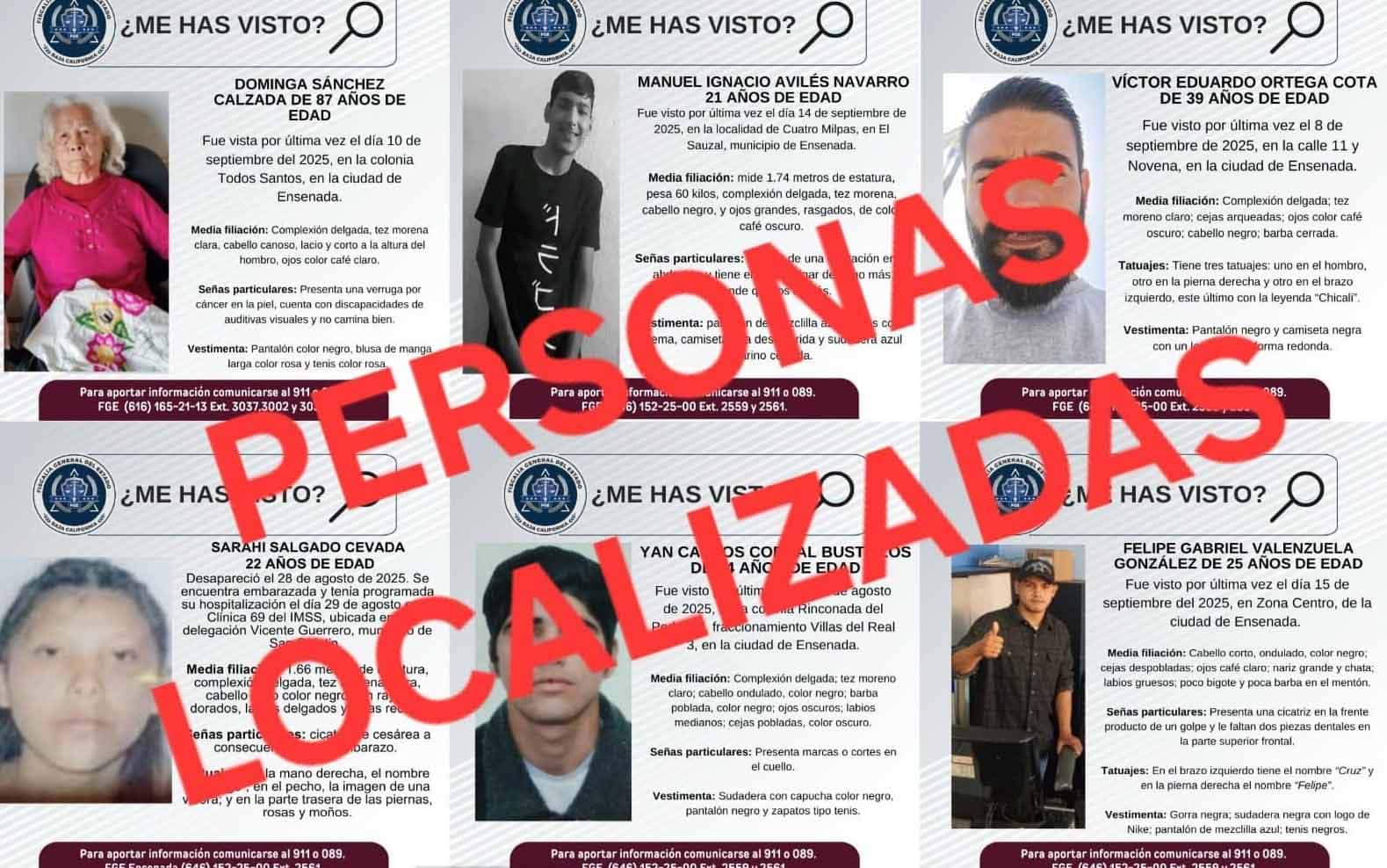 Ensenada.- La Fiscalía General del Estado informa localizaron con bien a seis personas que contaban con reporte de desaparición en el municipio de Ensenada.