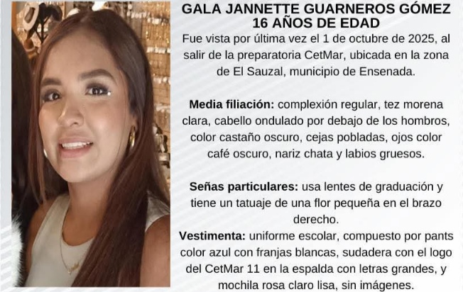 Ensenada.- La joven Gala Jannette Guarneros Gómez, de 16 años de edad, fue vista por última vez el 1 de octubre de 2025 al salir del Centro de Estudios Tecnológicos del Mar (CETMAR) en El Sauzal, municipio de Ensenada.