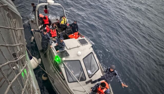 Por lo anterior, y con el objetivo de salvaguardar la vida humana en la mar, personal naval a bordo de una Patrulla Oceánica se aproximó al área señalada y desplegó su patrulla interceptora, para trasbordar a los 17 tripulantes (15 adultos y dos menores de edad) a la unidad de superficie naval.