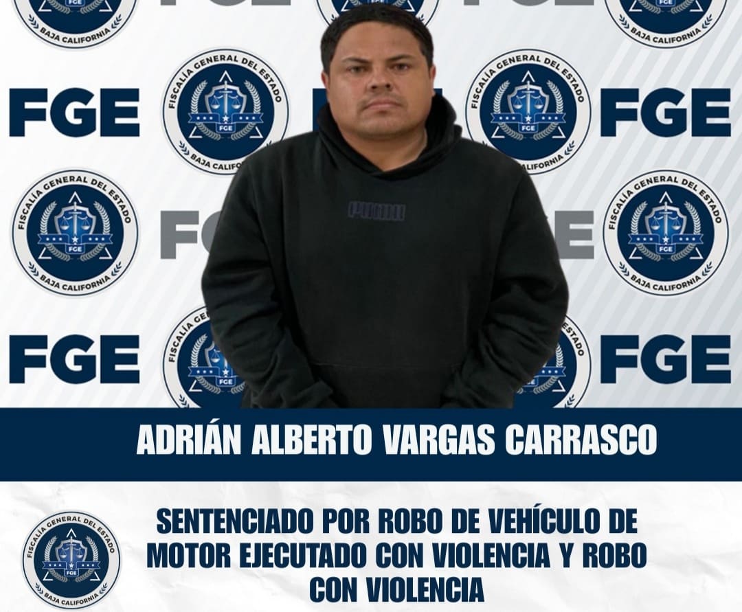 Ensenada.- Al concluir el proceso, Adrián Alberto Vargas Carrasco fue sentenciado a seis años de prisión por robo de vehículo de motor ejecutado con violencia y robo con violencia en el puerto de Ensenada.