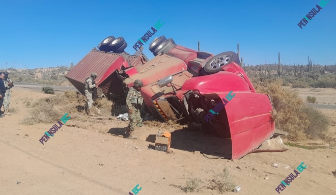 Trailero sufre volcadura en inmediaciones de Punta Prieta en el sur de San Quintín