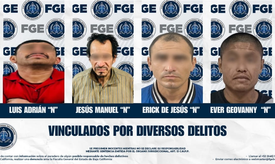 Ensenada.- La Fiscalía Regional de Ensenada informa que obtuvo la vinculación a proceso de cuatro personas detenidas en distintos puntos de la ciudad por su probable responsabilidad en la comisión de diversos delitos.