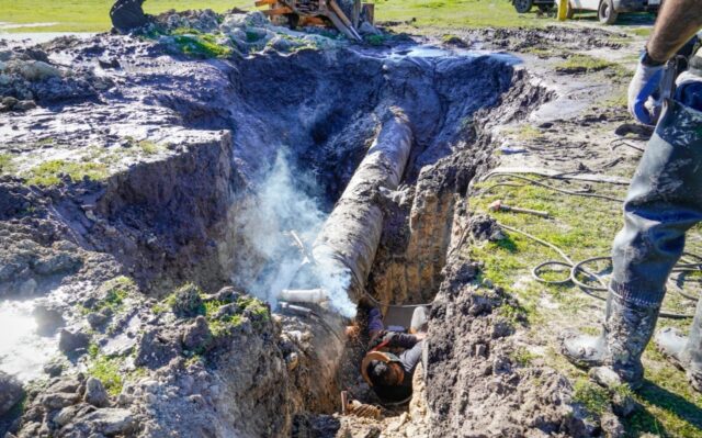 Ensenada.- Personal de la Comisión Estatal de Servicios Públicos de Ensenada (CESPE) realiza trabajos de reparación en el acueducto La Misión derivados de una ruptura, situación que obligó a suspender operaciones en el sistema hídrico con afectación al sector noreste de la ciudad.