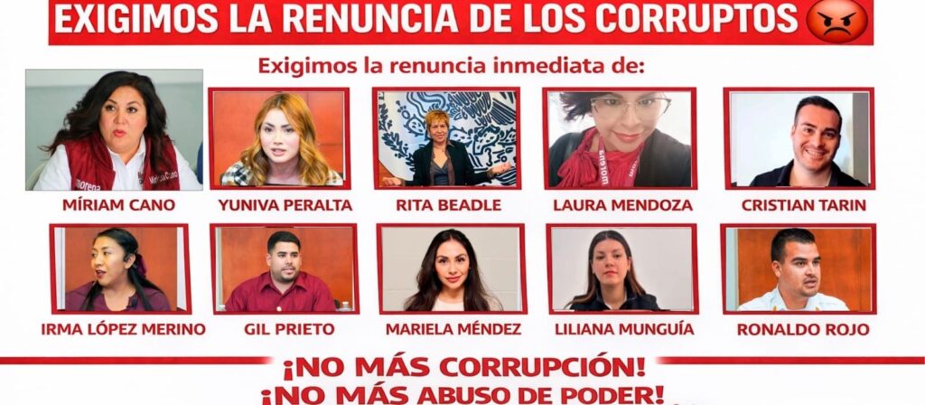 Entre los funcionarios señalados se encuentran la alcaldesa Miriam Cano Núñez, así como Yubiva Peralta, Rita Beatles, Laura Mendoza, Cristian Tarín, Irma López Merino, Liliana Munguía Acosta, Ronaldo Rojo Peralta, entre otros.
