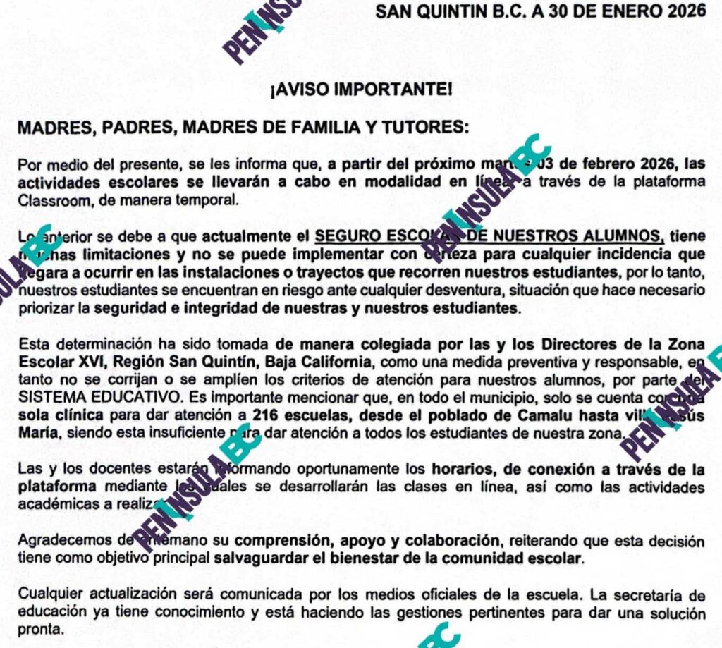 San Quintín.- Al menos doce secundarias del municipio de San Quintín optaron por impartir clases virtuales a partir del martes 03 de febrero tras denunciar limitaciones y falta de certeza con la cobertura actual del seguro escolar.