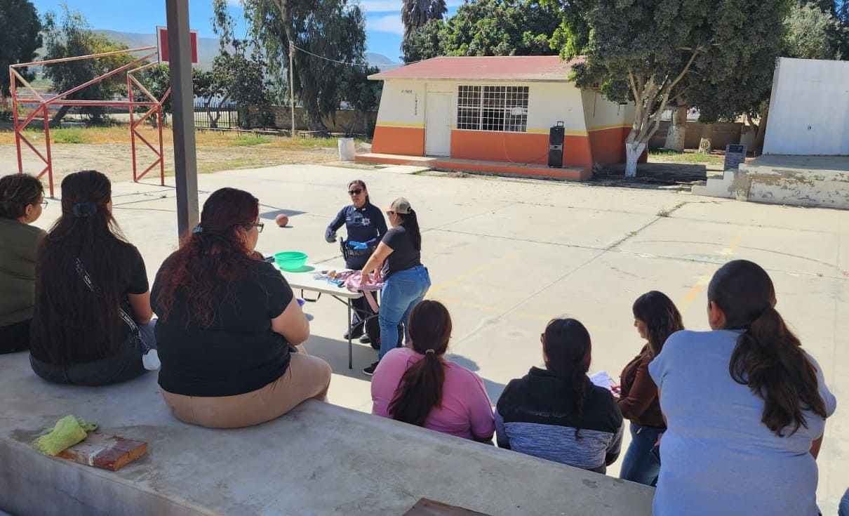 San Quintín, BC. – Con la finalidad de dar a conocer sobre los lineamientos para la revisión de pertenencias en los centros escolares (antes operativo mochila), agentes del área de Prevención al Delito impartieron una plática a padres y madres de familia de la Secundaria General # 41 de El Rosario.
