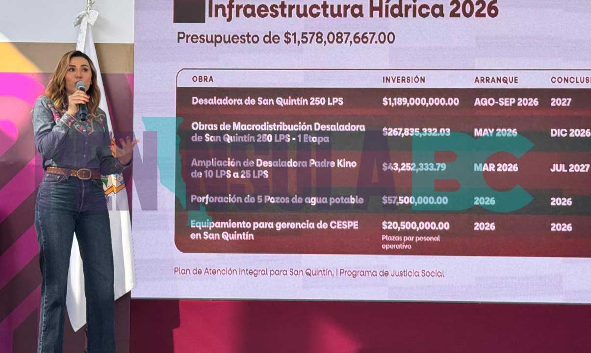 El principal proyecto contemplado en el rubro hídrico es la planta desaladora de San Quintín, con capacidad de 250 litros por segundo. Su inversión asciende a mil 189 millones de pesos. Las obras están programadas para arrancar entre agosto y septiembre de este año, para concluir durante el 2027.