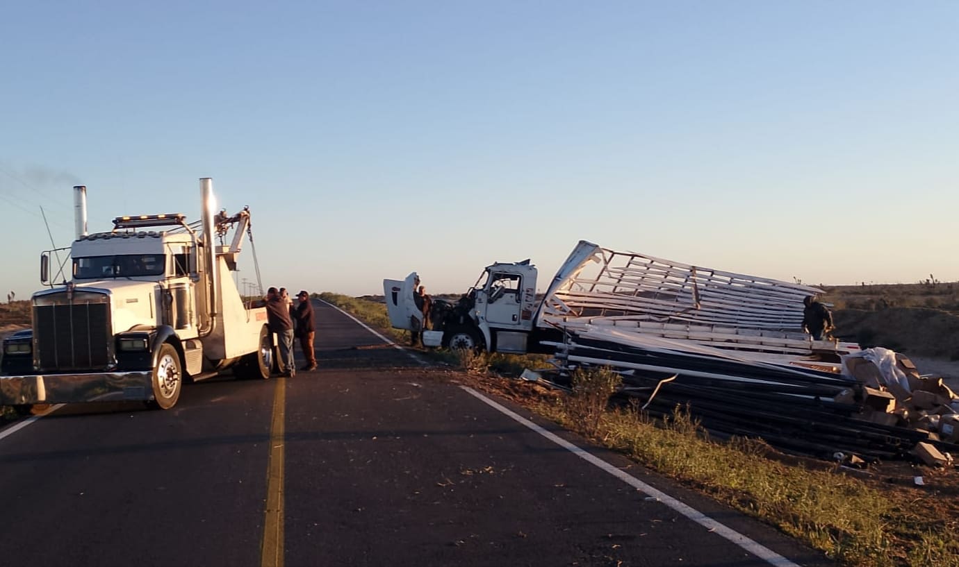 San Quintín, BC.- Al parecer por evitar impactar a un bovino, un tractocamión protagonizó una volcadura en las inmediaciones de Villa Jesús María, en el sur de San Quintín.