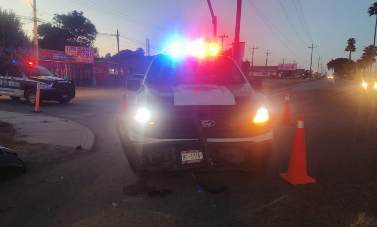 San Quintín, BC.- Una patrulla de la Policía Municipal fue impactada este sábado por una conductora en el semáforo ubicado en la zona comercial de San Quintín.