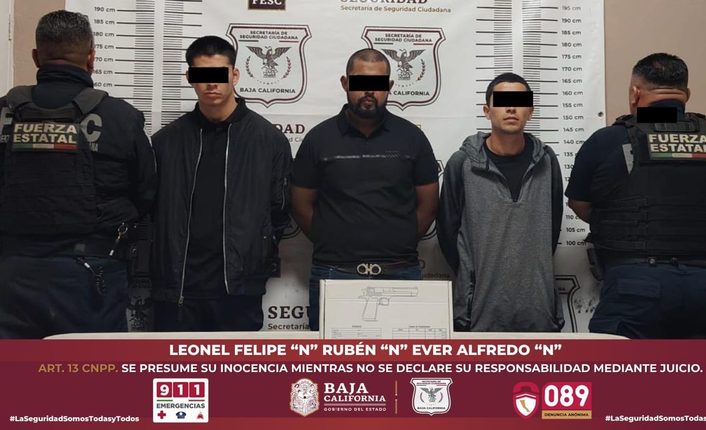 Ensenada, BC.- Tres sujetos con un arma de fuego corta fueron detenidos por agentes de la Fuerza Estatal de Seguridad Ciudadana (FESC) tras circular a exceso de velocidad por la calle Riveroll en la Zona Centro de Ensenada.