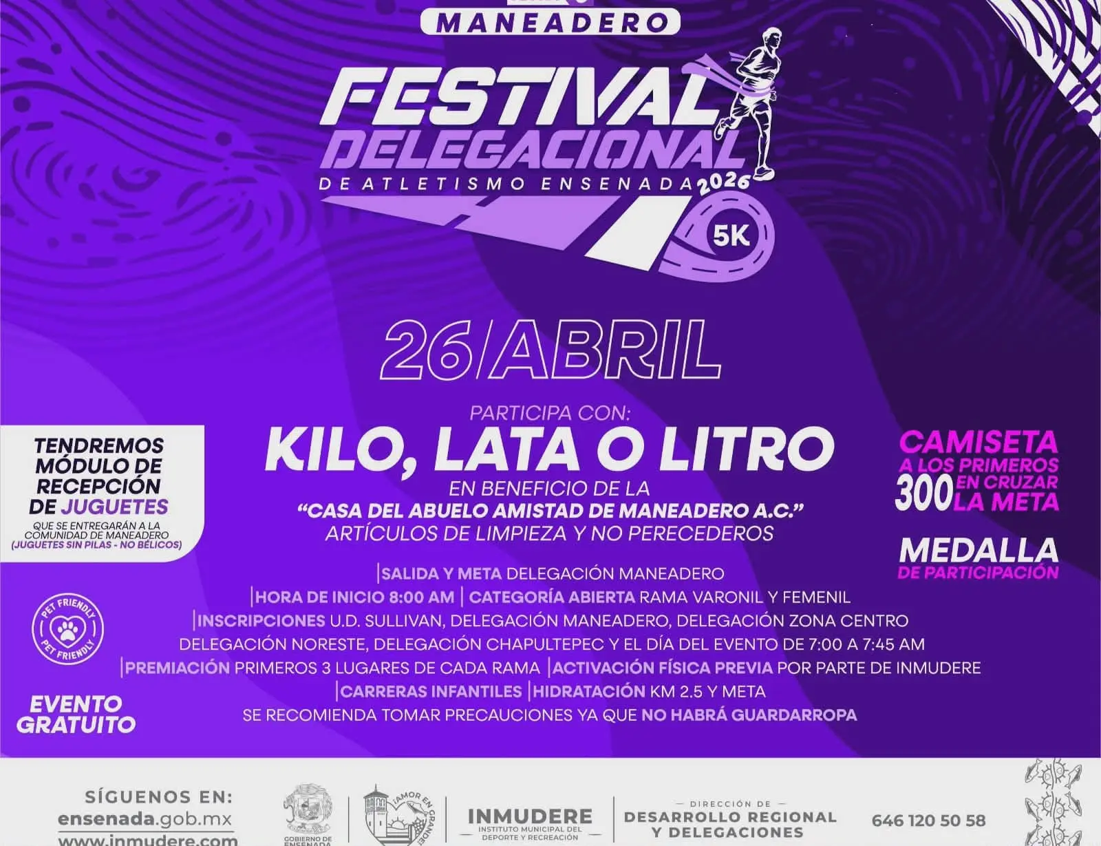 La actividad, promovida por el Instituto Municipal del Deporte y Recreación de Ensenada (INMUDERE), en coordinación con la Dirección de Desarrollo Regional y Delegaciones, consiste en una carrera recreativa de 5 kilómetros, programada para el domingo 26 de abril a las 8:00 horas, teniendo como punto de salida y meta la Delegación Maneadero.