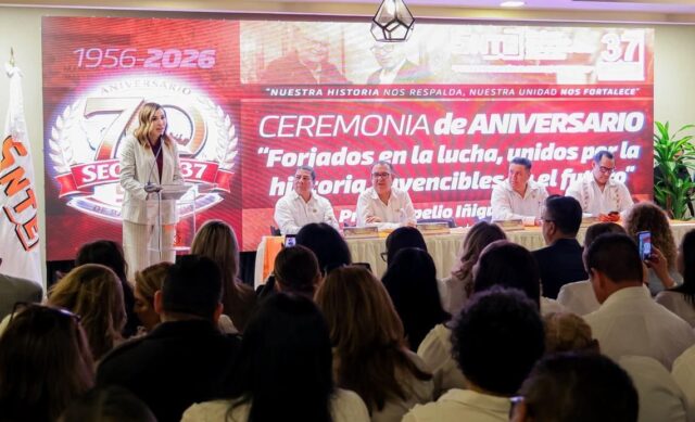 Mexicali, BC.– Bajo la convicción de que la educación es el eje central de la transformación, el Gobierno del Estado trabaja de la mano con el magisterio para saldar deudas históricas y dignificar la labor docente, destacó la gobernadora Marina del Pilar Avila Olmeda al encabezar el 70 aniversario de la Sección 37 del Sindicato Nacional de Trabajadores de la Educación (SNTE).