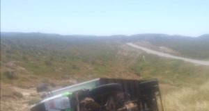 Volcadura de camión de reparto entre San Quintín y El Rosario