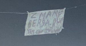 Cuelgan manta entre dos postes en el ejido Esteban Cantú